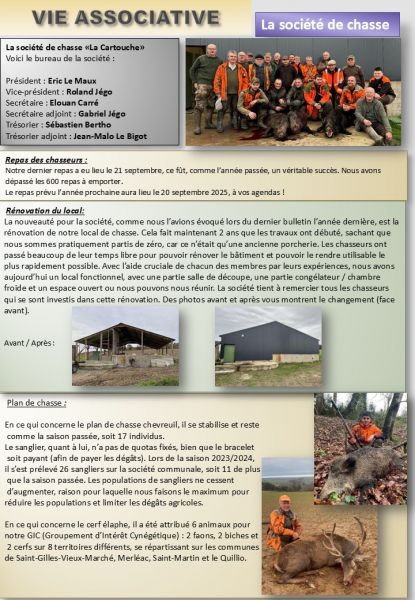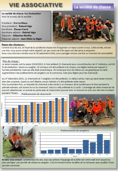 La société de chasse «La Cartouche» a le plaisir de vous partager cet article dans le bulletin municipal. A travers cet article nous allons vous montrer la vie associative de chasse durant ces 3 dernières années.